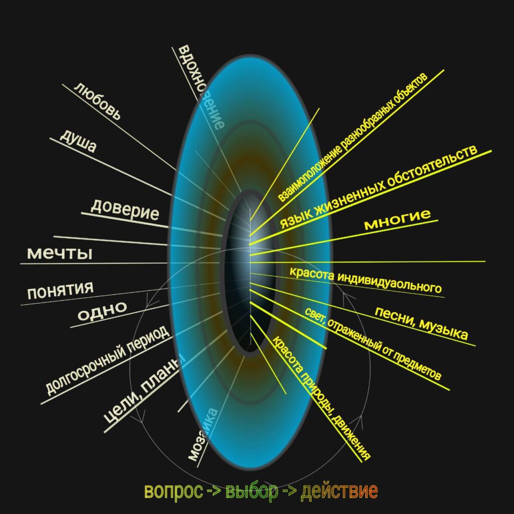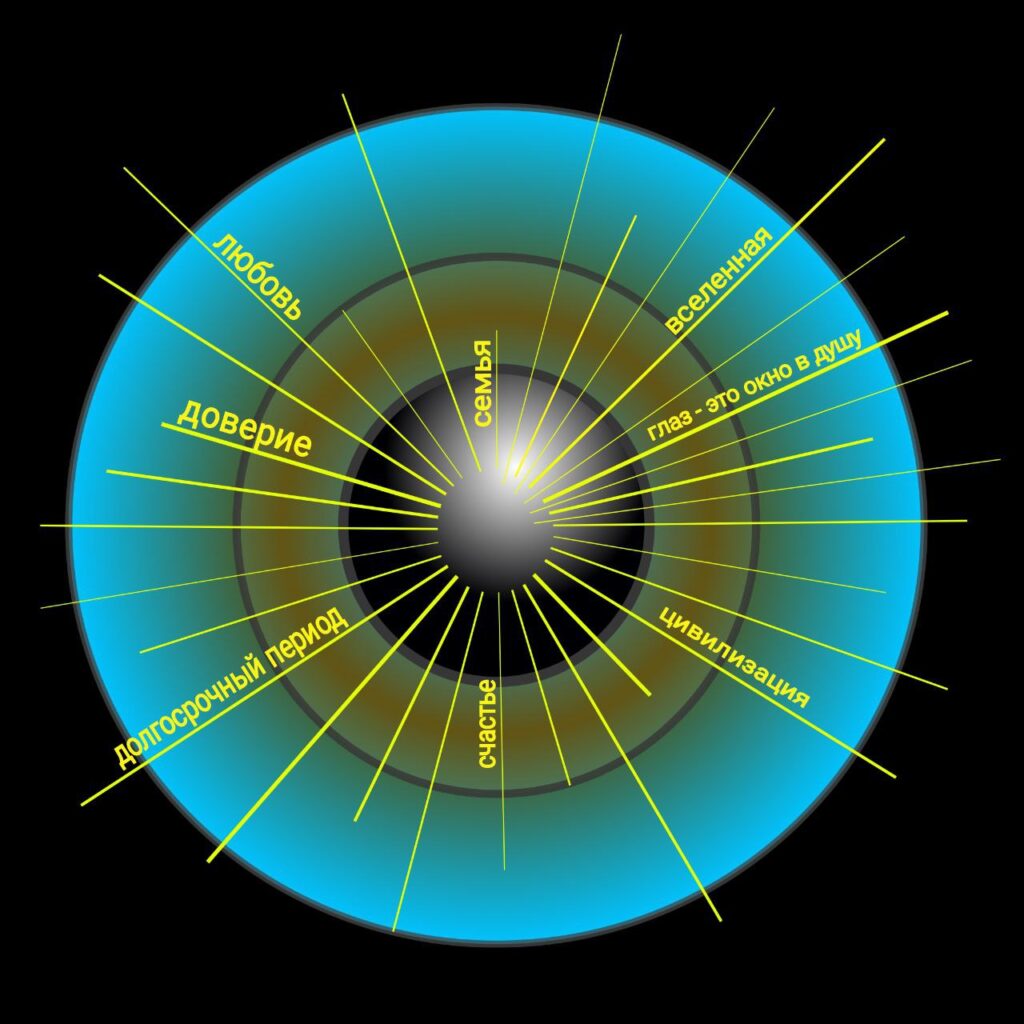 Oko. Asi nejvýznamnější smyslový orgán, pokud nepočítáme šestý smysl – zprávy z nejvyšších úrovní řízení. Ale abych to nezabil :). Povšimnu si struktury uspořádání oka jako orgánu přítomného v těle člověka. Na první pohled zde dominuje kruh. Když se na oko podíváme, vidíme tři hlavní části – vnější, střední a vnitřní, stejně jako je tomu v klasické trojbublině. Mám teď na mysli to oko, jehož části jsou viditelné. To znamená, že když začnu zvnějšku, vidím bělmo – vnější část oka. Bělmo mají všichni společné. Dokonce i černoši, Číňané a Eskymáci mají bílé bělmo. Proto se také jmenuje bělmo – od bílé barvy. Tedy okolí je společné všem. Střední část, tzv. duhovka, vlastně určuje barvu oka. Když říkáme, že někdo je hnědooký nebo modrooký, je to právě tím, jakou má barvu duhovky. Duhovka je zajímavá svou strukturou. Jeví se být složená z takových do středu vedoucích paprsků, vlásečnic. Vnitřní část – čočka – se jeví být černá. A to zase opět u všech lidí. To znamená, že běloch má černou čočku a černoch také. Ve skutečnosti je ale čočka průhledná, neboť skrze ni prochází paprsky světla, do nichž se poskládal obraz.