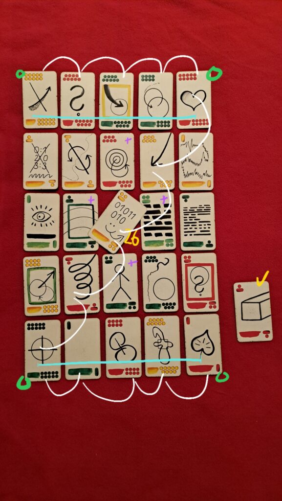 Poslední linie výkladu je také silná. Obsahuje zleva doprava karty Umění, Celkovost, Dialog, Moc, Příroda. Tato sekvence jednoznačně zakotvuje dialog jako prostředek dalšího postupu. Ale je nutné, aby šlo o otevřený tandemový hledající dialog, který se stává polem rozkrývání rozvojových podmínek dalšího vývoje. I karta Celkovost hraje svůj význam a jejím prostřednictvím vchází do hry Trojbublina. Schéma trojbubliny pomůže v tříštícím se a nestabilním prostředí hroutící se pyramidy davo-“elitarismu” udržet stabilní obraz světa a života již pravdověrný, pravdivý a zároveň opřený o pravou víru. Neboť nejsme schopni poznat vše a něco nám vždy bude přicházet z oblasti víry. A v té je nutné se opřít výhradně o jednoho jediného dobrého Boha. Moc se podřídí přírodním principům a míře, tedy její základnou se stane mravnost ve smyslu životu adekvátní míry vyrůstající z živého dialogu jednoho s druhým a všech s Bohem. Vše se odehrává v přírodě. Rodina → Příroda → Bůh (Rod).