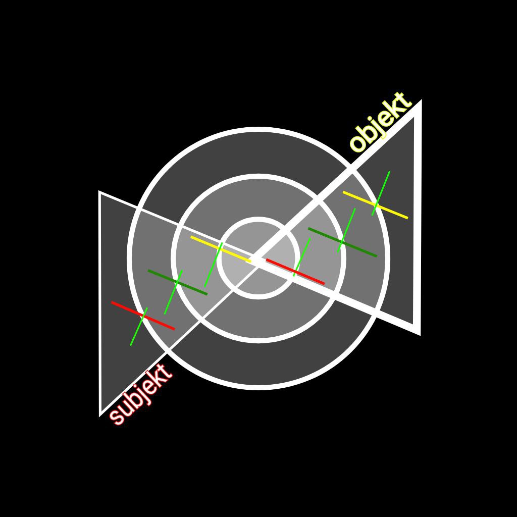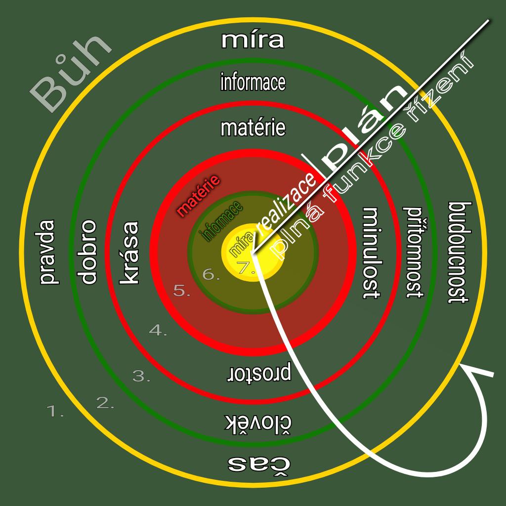 Schéma geneze Všeho-Míra. Postup přes triádu Míra (diference/rozlišení) -> Informace (sjednocení) -> Matérie (rozlišení) = Objekt (neboli objektivní realita až do materiálních podmínek vhodných pro vznik života neboli subjektivity uvnitř objektivity) => již v Matérii proces vzniku Subjektu: Matérie -> Informace -> Míra (neboli návrat Boha k sobě samému skrze něco ‘vnějšího’ a v něm realizovaného Rozlišení Míry čili Pravdy Dobra a Krásy).