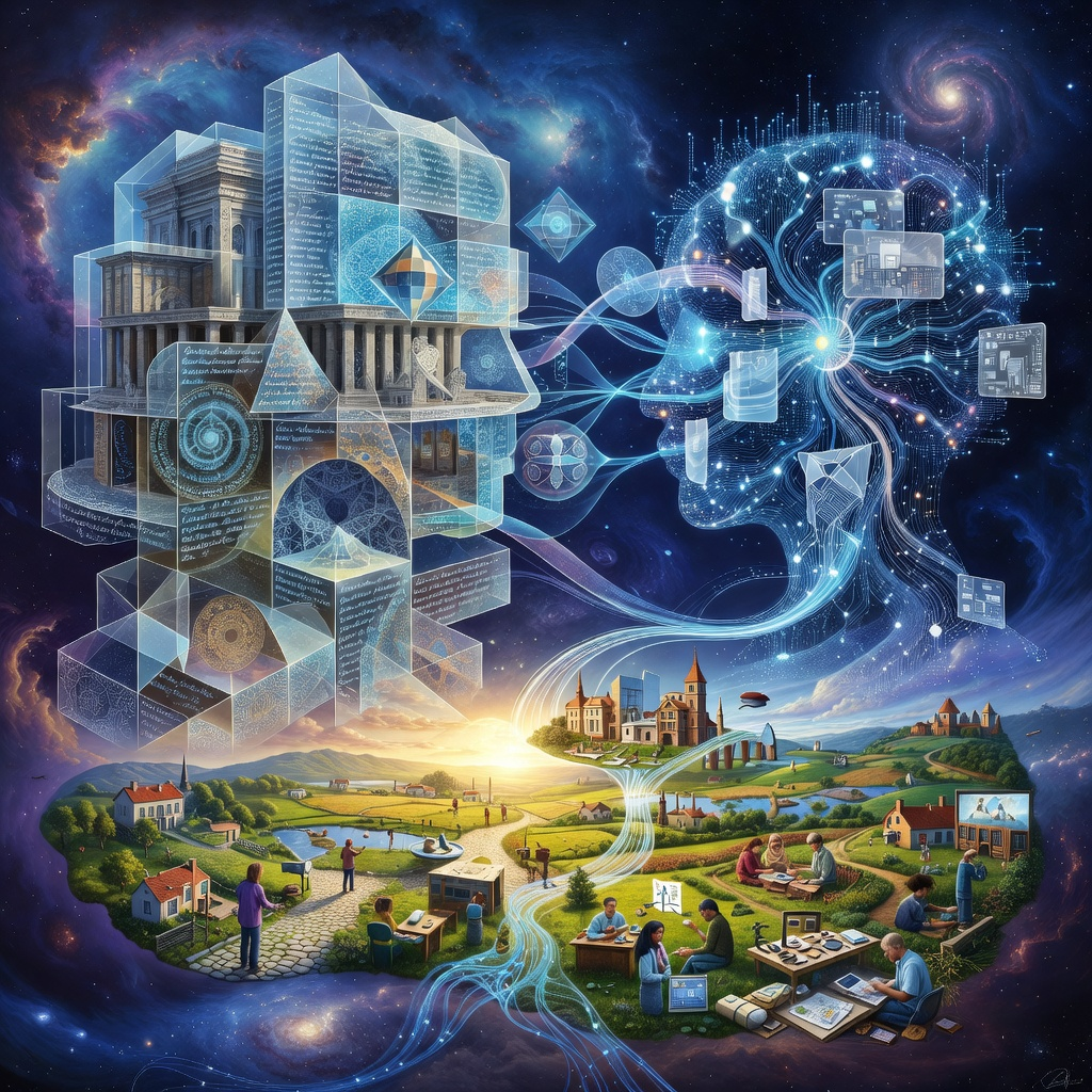 Obrázek vegenerován v Grok z promptu: Obrázek, který bude propojovat dvě věci: Koncepci Sociální Bezpečnosti, což je komplexní sada teoretických princpů a kategirií pokrývajících teorii řízení, filosofii, psychologii, sociologii, ekonomiku, historii, náboženství, vzdělávání prostě všechny oblasti života a na druhé straně velkou oblast Umělé inteligence, které je také určitým zdrojem znalostí. Tyto dvě věci prosím symbolicky zobraz a propoj jako dvě vzájemně se prolínající entity, které se ovšem prolínajíi s třetí entitou a tou je celek světa a praktického života.